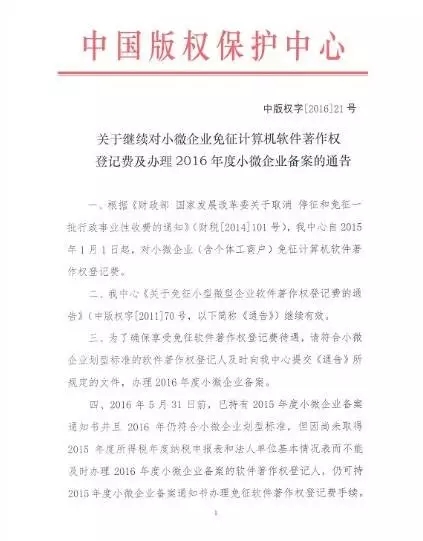 關(guān)于繼續(xù)對小微企業(yè)免征計算機(jī)軟件著作權(quán)登記費(fèi)及辦理2016年度小微企業(yè)備案的通告